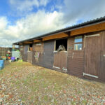 The stables and storage sheds are constructed from timber and arranged around a hardcore courtyard. There are two 12' x 14' stables with extended canopies and a timber talk grill between them. A separate feed room adjoins the stables, alongside a 10' x 10' tack room. A further 24' x 12' stable block is divided into two more stables. An additional 24' x 12' storage unit is present, and planning permission has been granted for another unit to complete the stable yard quadrant.